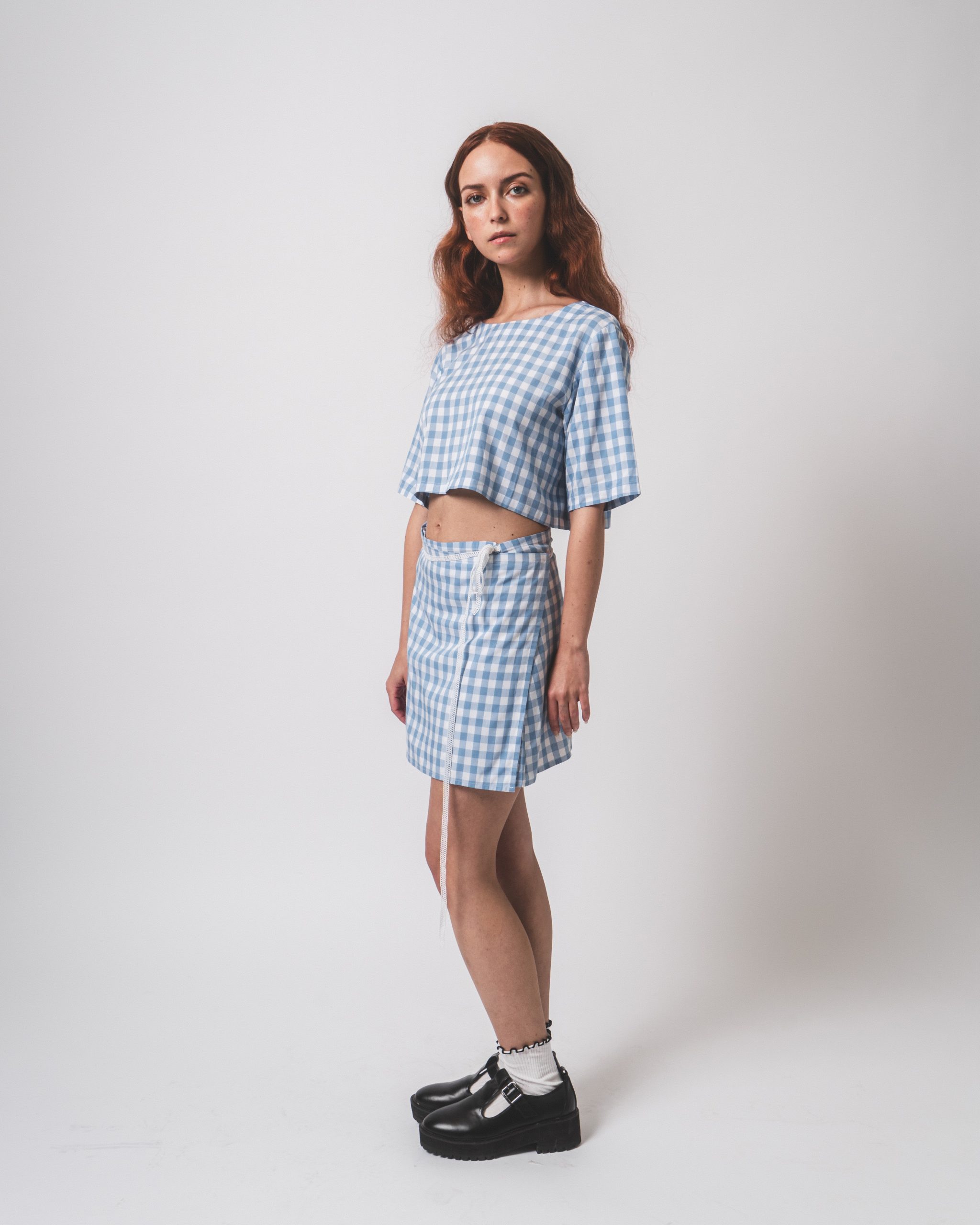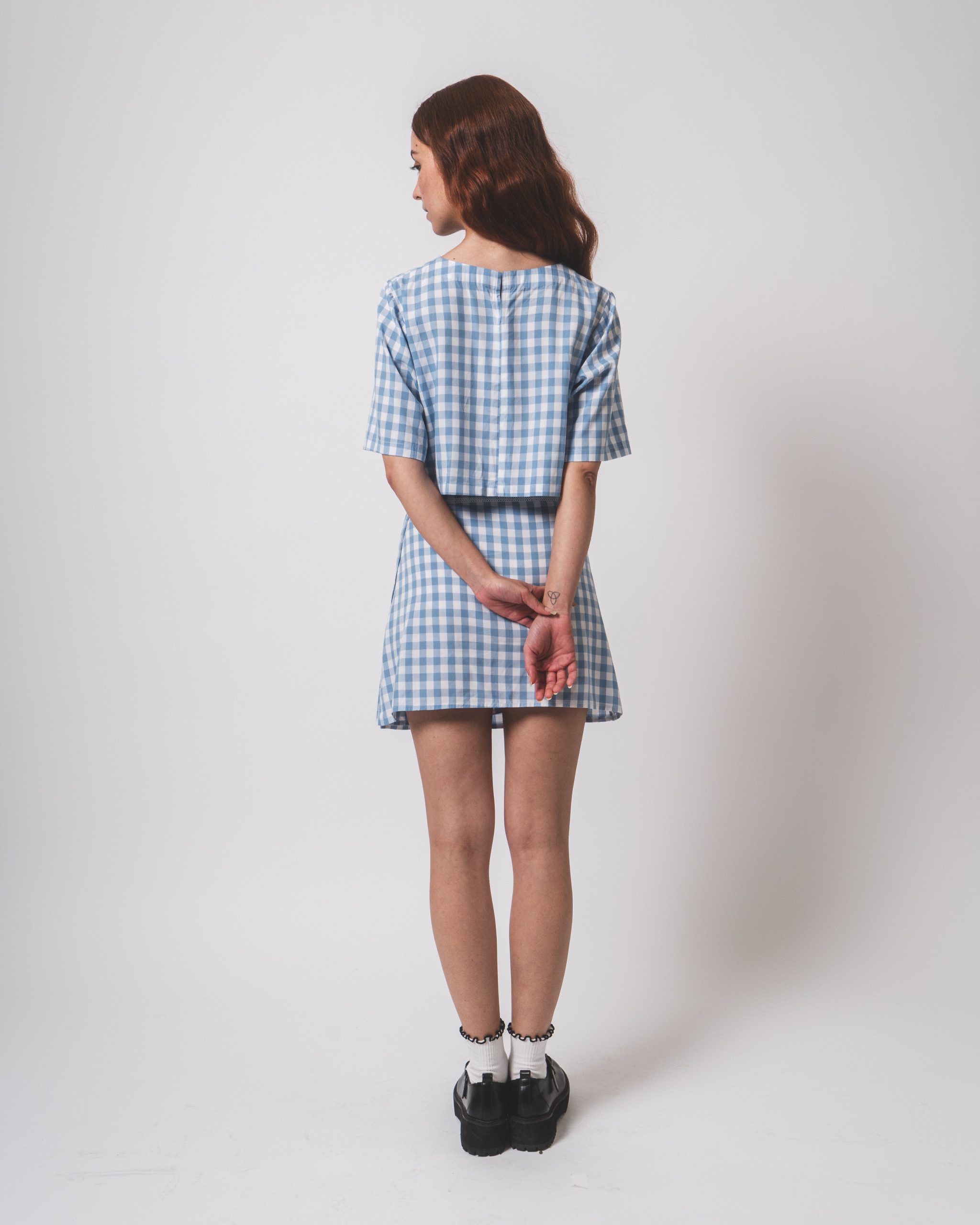 • Introduction: Get checked in style! in our blue and white checks top and skirt co-ords