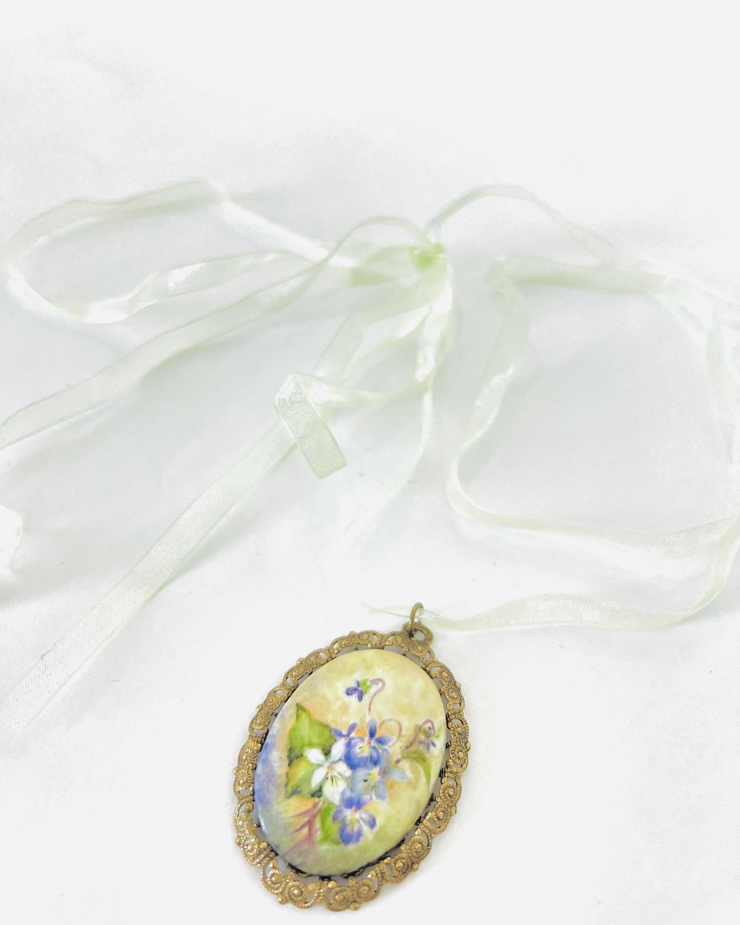 • Materials: Bronze brass and mint tissue ribbon